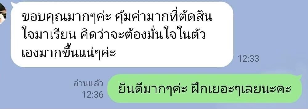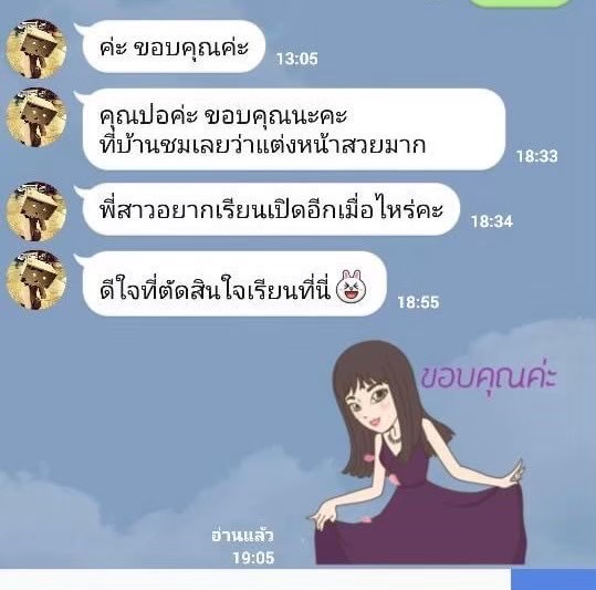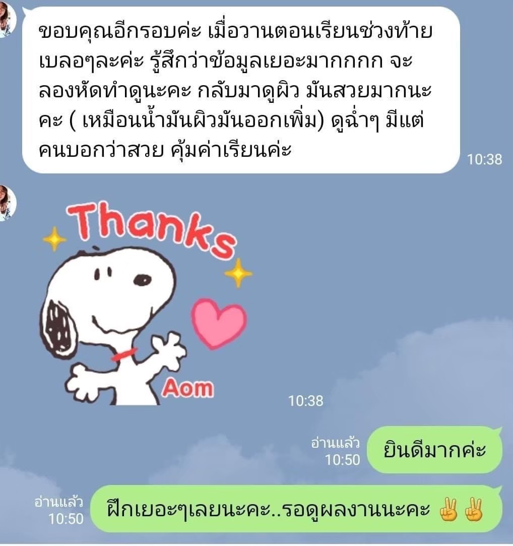 - มีการโฟล์เลอร์ติดตามผู้เรียนตลอด หลังจบคลาสปรึกษาเพิ่มเติมได้เสมอ ไม่มีการขายเครื่องสำอางแอบแฝง